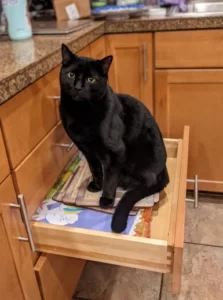 Licorice often sprawls on the floor in front of the heat register and sometimes he finds an odder place, such as the placemat drawer pictured above. Sometimes he attacks my ankles, which makes me yelp if I am barefoot and laugh if my ankles are covered. I have no idea why he does this.